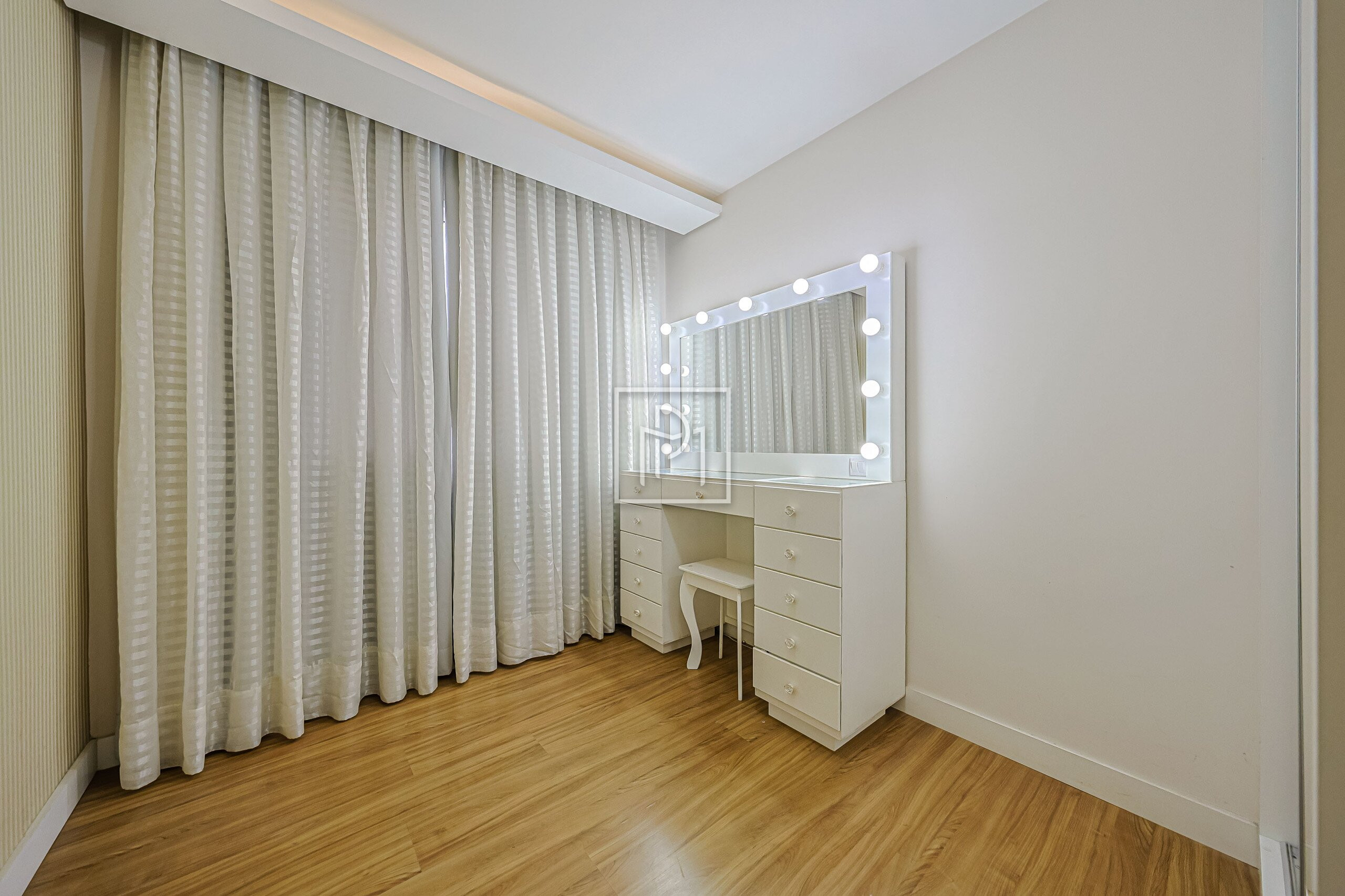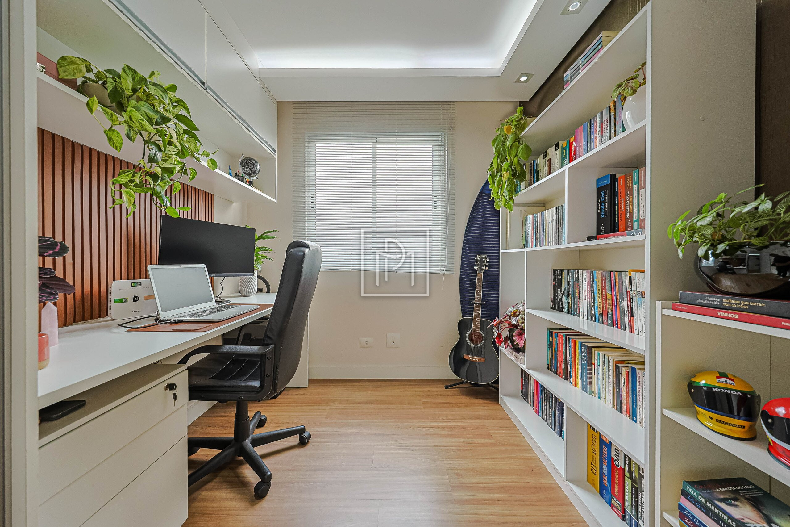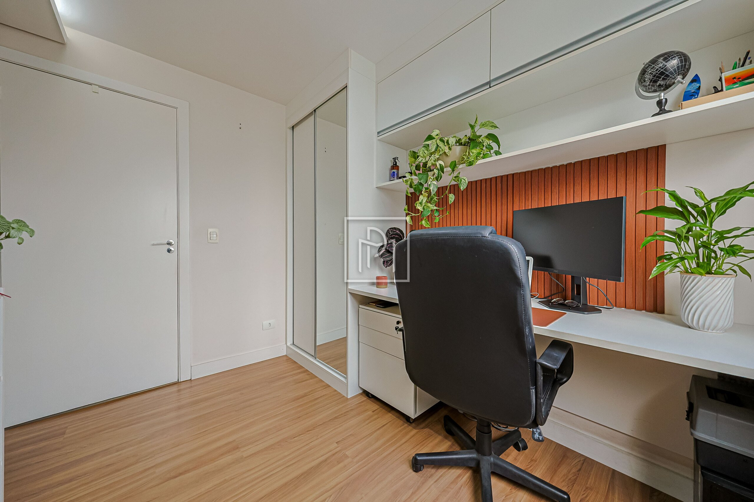 Outro quarto recebeu escritório projetado com muito bom gosto, bonito mesmo! Estrutura diferenciada para seu home office, com fácil reversão para planta original.